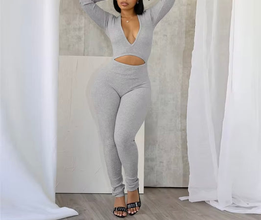 Women’s Long Sleeve Jumpsuit - Sexy Ribbed Knit Cutout Jumpsuit – Long Sleeve Bodycon One Piece Outfit