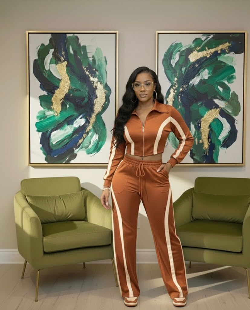 Level up your lounge game with the Vybe Luxe Stripe 2-Piece Set; where sporty meets chic. This matching set features a sleek zip-up crop jacket and high-waisted drawstring pants with bold contrast stripes that elongate your silhouette. The soft, stretchy fabric moves with you, making it perfect for errands, brunch dates, or casual nights out.